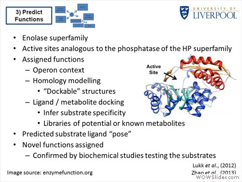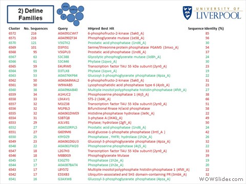 The aim of the study was to identify novel functions for members of the Histidine Phosphatase Superfamily, focussing on large groups of hypothetical proteins. To achieve this, the first phase of the investigation was the collection of a complete set of Histidine Phosphatase sequences using the iterative search program Jackhmmer (Eddy, 1998; Finn et al., 2011). The second phase was to partition the collected sequences, using sequence similarity, into "clusters" that likely share the same function by utilising CLANS (Frickey & Lupas, 2004; Frickey & Weiller, 2007). As the emphasis was the prediction of novel functions, the next stage was to eliminate clusters of Histidine Phosphatases with known functions by performing database searches. The final phase was to predict the functions of the remaining large clusters of HPs, using a variety of bioinformatics methods including genomic context, homology modelling and metabolite docking. STRING (Szklarczyk et al., 2015) was proposed for visualising genomic context, identifying predicted functional partners and determining potential ligands for subsequent docking, using the RosettaLigand (Combs et al., 2013), into homology modelling created with RosettaCM (Combs et al., 2013).